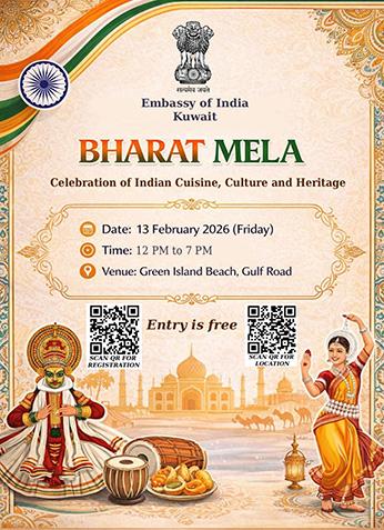 يُقام مهرجان بهارات ميلا، الذي تنظمه سفارة الهند في الكويت، يوم الجمعة الموافق 13 فبراير، على شاطئ الجزيرة الخضراء على طريق الخليج العربي.