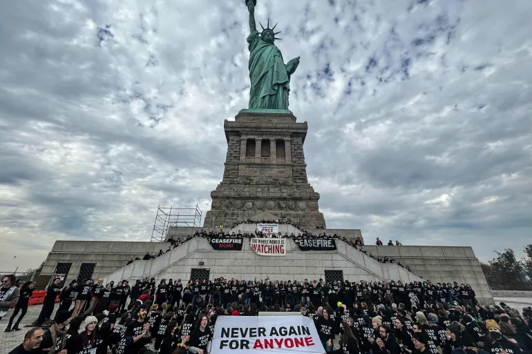 احتلّ مئات الناشطين اليهود الأميركيين التقدميّين تمثال الحرية في نيويورك لمطالبة كيان الإحتلال الصهيوني بوقف إطلاق النار في غزة، ووضع حدّ لما يتسبّب به قصف قوات الإبادة من إبادة جماعية للمدنيين في القطاع.