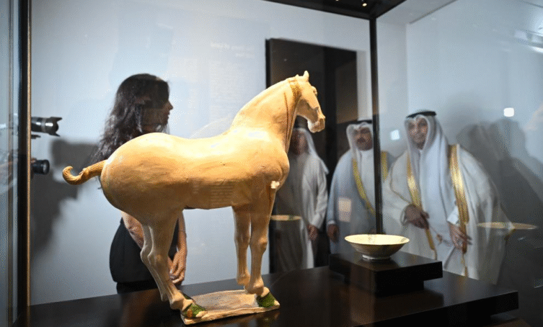 ويضم المعرض 128 قطعة أثرية متنوعة من مجموعة الصباح الأثرية توثق رحلة التبادل الفني والثقافي بين الحضارتين الصينية والإسلامية عبر آلاف السنين.