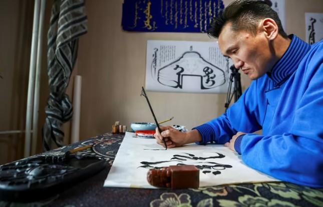تعلم كتابة النص المنغولي التاريخي في مركز Erdenesiin Khuree مع خبراء الفن المحليين.