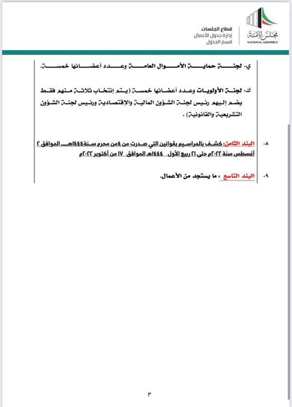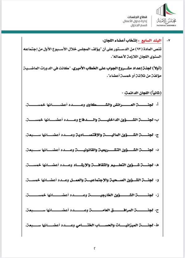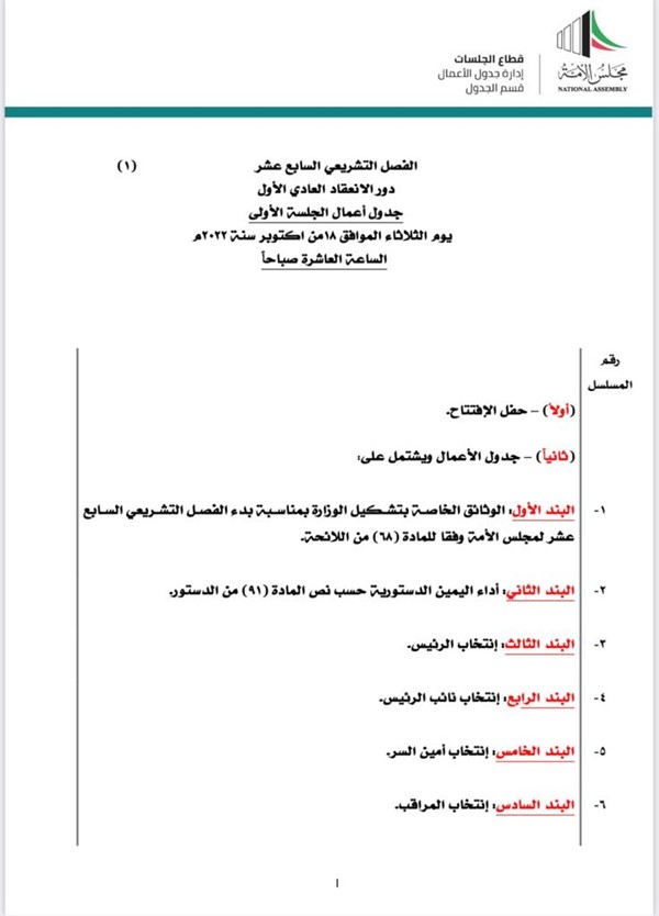 وزّعت الأمانة العامة في مجلس الأمة اليوم جدول أعمال جلسة افتتاح دور الانعقاد العادي الأول من الفصل التشريعي السابع عشر والتي ستعقد صباح يوم الغد