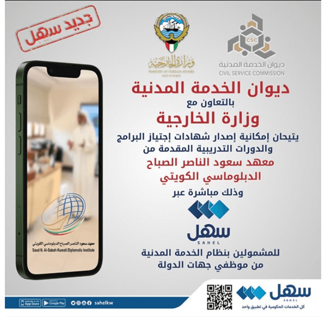 أعلن ديوان الخدمة المدنية أنه بالتعاون مع وزارة الخارجية يتيحان إمكانية إصدار شهادات اجتياز البرامج والدورات التدريبية المقدمة من معهد سعود الناصر الصباح الديبلوماسي الكويتي مباشرة عبر تطبيق سهل للمشمولين بنظام الخدمة المدنية من موظفي جهات الدولة.