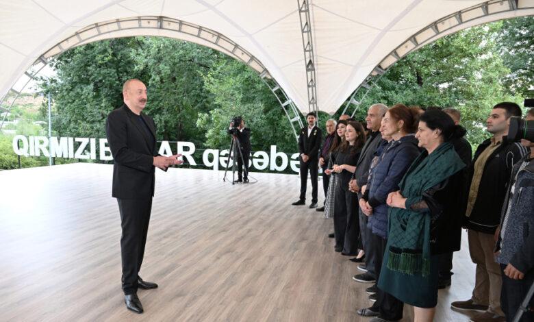 وأفاد علييف: ” يسرني أنكم عدتم إلى أراضي أبائكم وأجدادكم وتقيمون فيها وقد تمت تهيئة جميع الظروف الضرورية لكم هنا وبنيت البيوت وبعضها قد أصلحت وفيها كل ظرف من المياه للشرب والغاز الطبيعي والطاقة الكهربائية ومرافق التدفئة حتى المدرسة والمركز الطبي والطرق المعبدة والاهم منها أن هنا ديار قراباغ الأم”.