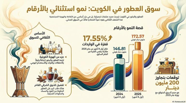 في الكويت العطور والبخور ليست مجرد منتجات تجميل شخصية، بل ثقافة مجتمعية عميقة متجذرة في التراث والهوية الكويتية، ترتبط ارتباطا وثيقا بالاحتفالات والمناسبات الاجتماعية والاستخدامات الشخصية. هذا الشغف يتجسد في الإنفاق الشخصي والعائلي بالسوق المحلي الذي يشهد تحولا ديناميكيا سنويا وبأرقام كبيرة، فوفقا لآخر بيانات صادرة عن الإدارة المركزية للإحصاء، بلغ إجمالي واردات الكويت من الزيوت العطرية ومستحضرات العطور والتجميل ما قيمته نحو 172.57 مليون دينار، في أول 8 أشهر من عام 2025، مسجلة قفزة بلغت نسبتها 17.55% وبما قيمته 25.766 مليون دينار، بالمقارنة مع حجم تلك الواردات في الفترة نفسها من عام 2024 والبالغ نحو 146.81 مليون دينار.