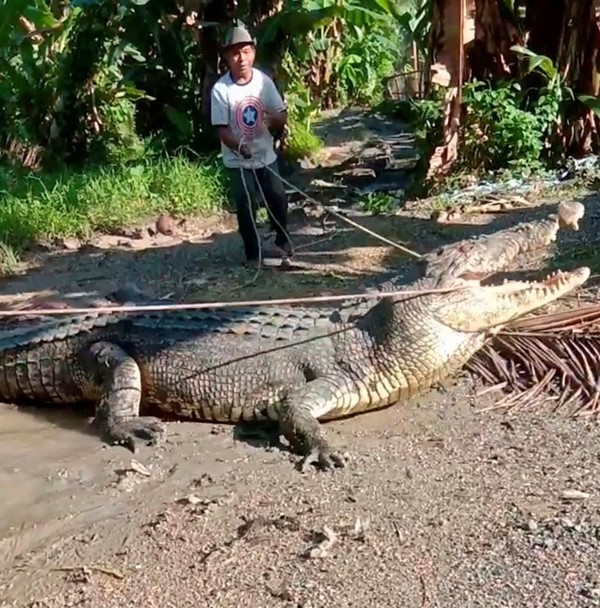 أشاد سكان قرية إندونيسية بنجاح أحد أفراد القرية في اصطياد تمساح يتجاوز طوله أربعة أمتار في جزيرة سولاويسي باستخدام حبل فقط.