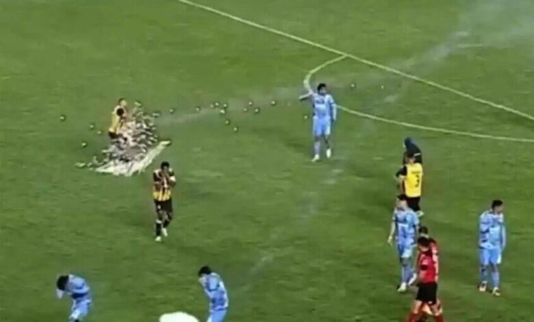 بالفيديو…لحظة صادمة لإصابة لاعب كرة قدم بألعاب نارية بمنطقة حساسة في جسده