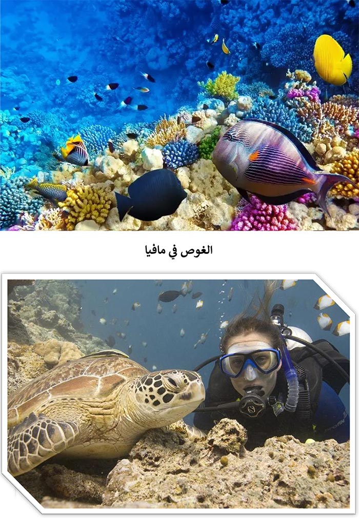 تتميز مافيا بشواطئها الذهبية و تمتلئ مياهها بالأحياء البحرية المثيرة كالأسماك الملونة والهامور العملاق والأخطبوط إضافة إلى الدلافين والقرش حيث تتواجد في الأماكن الأكثر عمقًا من المياه، وفي الليل يمكن مشاهدة زحف السلاحف على الشواطئ البعيدة للتعشيش .