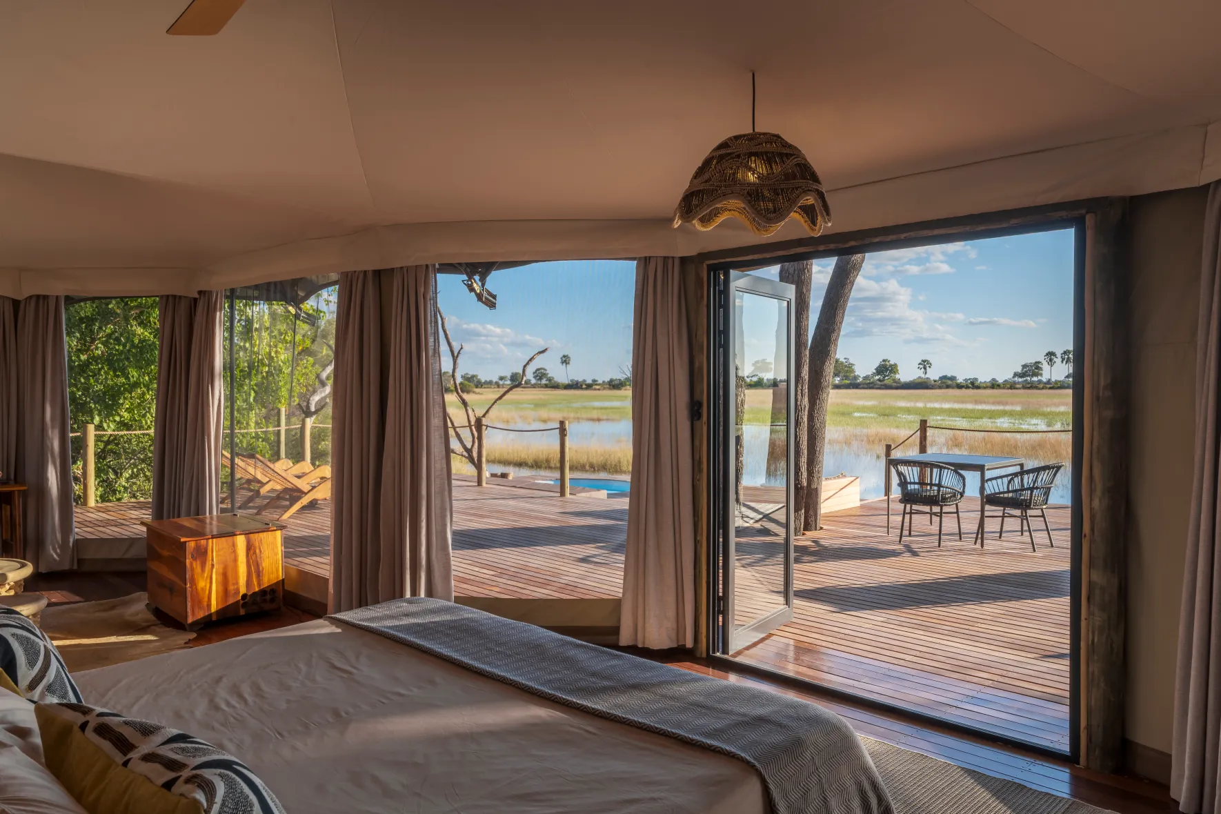 تضمّ الخيام الواسعة أسِرّة مريحة، وحمامات فاخرة، وشرفات تطلّ بزاوية 180 درجة على مياه الدلتا، بالإضافة إلى دُش خارجي يمنح الزوار تجربة استحمام فريدة تحت سماء أفريقيا المفتوحة.