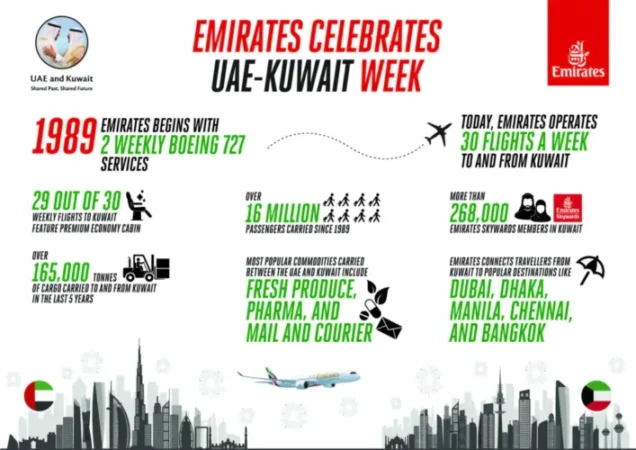 انضمت طيران الإمارات إلى احتفالات أسبوع الإمارات والكويت بسلسلة من التجارب المميزة على متن طائراتها، احتفاءً بالعلاقة التاريخية والمتينة بين البلدين.وبهذه المناسبة، أسعدت الشركة ركاب رحلاتها الأسبوعية الثلاثين بين دبي والكويت بتشكيلة مختارة من الحلويات التقليدية في جميع درجات السفر.