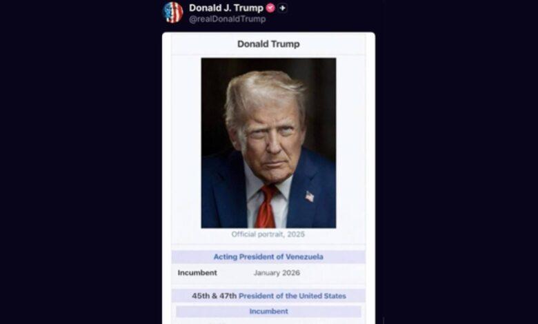 في تطور لافت، نشر دونالد ترامب، صورة له من «ويكيبيديا» تحت عنوان «رئيس فنزويلا بالوكالة»، مُلمّحاً بسخرية إلى شرعية ديلسي رودريغير، نائبة الرئيس نيكولاس مادورو، والتي تولت زمام السلطة بعد اعتقاله في 3 يناير الجاري، على يد قوة أميركية خاصة.