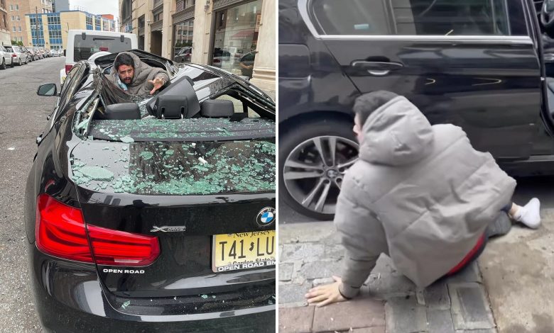 وهبط الرجل البالغ من العمر 31 عاما، والذي لم يتم الكشف عن اسمه، على سقف سيارة “BMW” سوداء، حيث شوهد وجهه مضرجا بالدماء، أثناء قيامه من تحت “الأنقاض”.