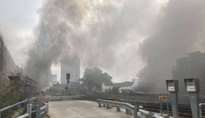 تسبب الحريق في توقف القطارات بالمنطقة وإخلاء العديد من المباني.