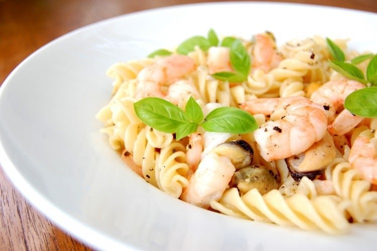 ضعي المكرونة في صحن التقديم وأضيفي الروبيان والكريمة فوقها.