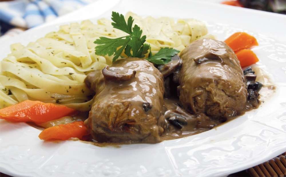 تسكب هذه الصلصة فوق لفافات اللحم ويقدم الطبق مع المعكرونة.