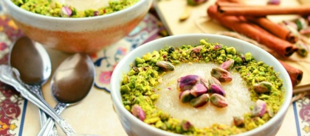 زيني المامونية بالقرفة، الفستق والصنوبر. وزعي بقية الجبن على المامونية وقدميها ساخنة.