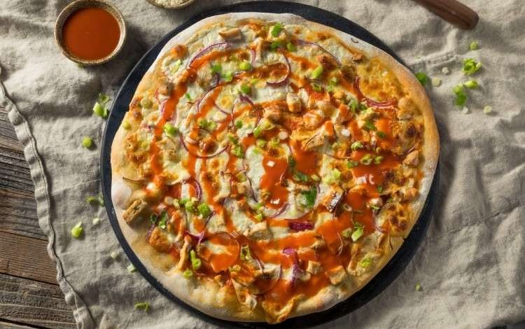 ضعيها في صينية البيتزا ومدي عليها الصلصة الكريمية ثم الدجاج المتبل بصلصة البافلو ثم برش موزاريلا فريكو والجبنة الزرقاء.