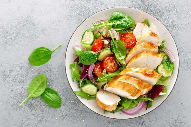 قطعي الدجاج شرائح ورتبيه فوق السلطة.