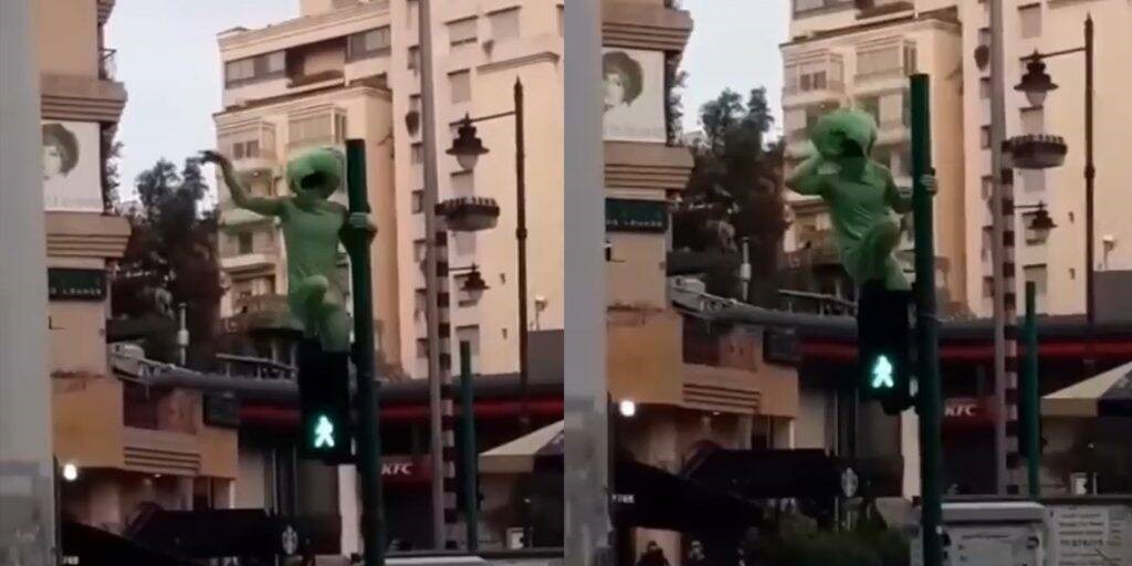 شاب يرتدي زي “مخلوق فضائي” ويقوم بحركات بهلوانية تثير البهجة لدى المواطنين. وفق ما ورد في موقع ” سبوتنيك”.