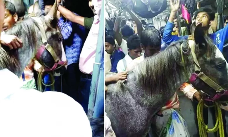 وأظهر الفيديو الذي تداوله رواد مواقع التواصل، ونشره موقع «إنديا توداي»، حصاناً في قطار مزدحم بالركاب، حسب ما ذكر موقع سكاي نيوز. وأشار بعض رواد مواقع التواصل ممن شاهدوا الفيديو، إلى أن الحصان كان مشاركاً في سباق أقيم بمنطقة بارويبور بذات اليوم الذي تم فيه نشر المقطع.