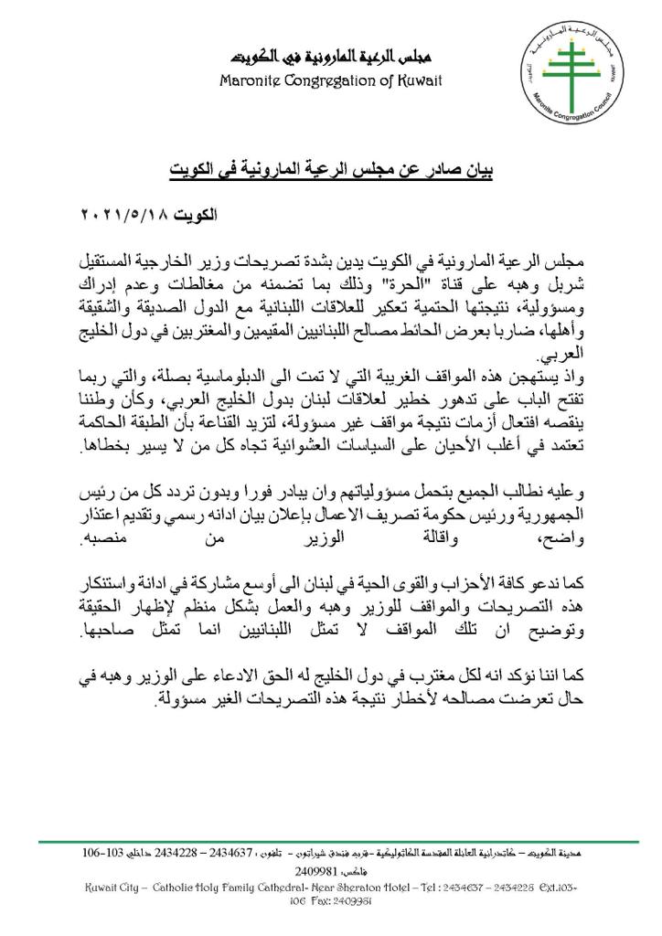 دان مجلس الرعية المارونية في الكويت بشدة تصريحات وزير الخارجية اللبنانية المستقيل شربل وهبة على قناة «الحرة» بما تضمنه من مغالطات وعدم إدراك ومسؤولية، نتيجتها الحتمية تعكير للعلاقات اللبنانية مع الدول الصديقة والشقيقة وأهلها، ضاربا بعرض الحائط مصالح اللبنانيين المقيمين والمغتربين في دول الخليج العربي.