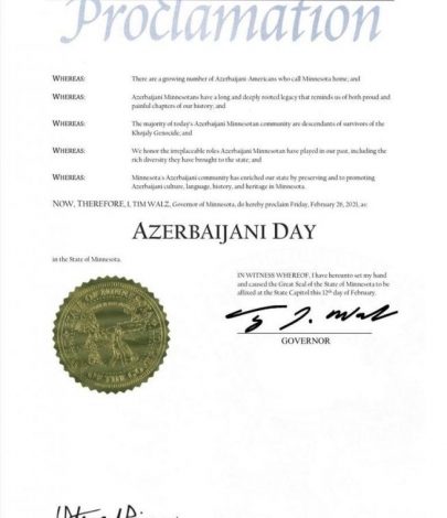 محافظ ولاية مينسوتا الامريكية يعلن 26 فبراير يوم اذربيجان