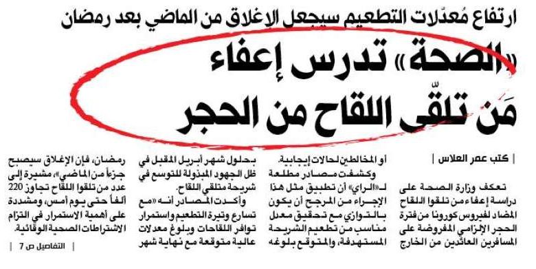 تأكيداً لما نشرته «الراي» في 23 فبراير الماضي، أعلن مركز التواصل الاجتماعي عن إعفاء 3 فئات من المسافرين القادمين إلى الكويت ممن تلقوا اللقاح المضاد لفيروس كورونا من الحجر المؤسسي الإلزامي، وهي:
