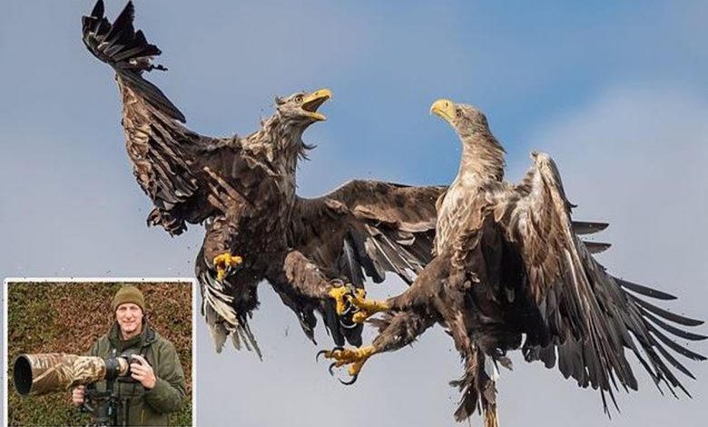 تمكن مصور بريطاني، أخيراً، من التقاط صورة مذهلة لنسرين من أكبر الطيور الجارحة في المملكة المتحدة، وهما يتشاجران فوق بحيرة أسكتلندية في جزيرة مول، في نوبة من الغضب والصراخ.
