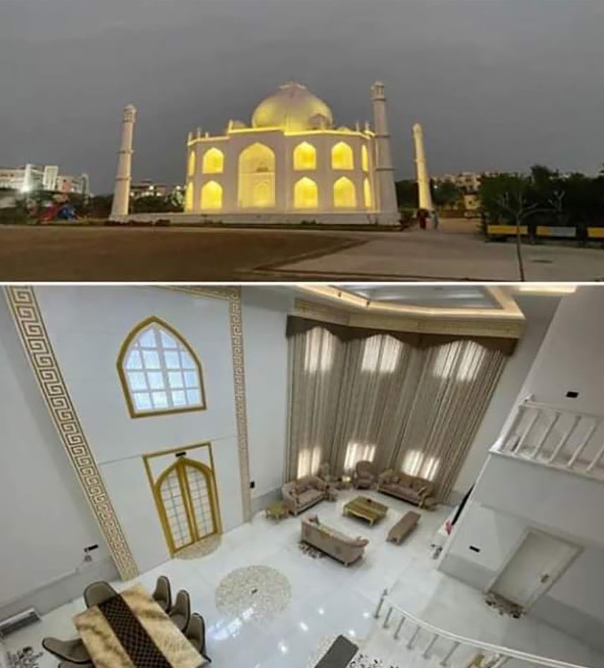 وكان الرجل يخطط في الأصل لبناء مبنى بارتفاع 80 قدماً، ولكنه ألغى مخططه بعد أن رفضت السلطات منحه التراخيص المطلوبة لبناء مثل هذا الهيكل، فواصل تشييد المنزل على أساس الهندسة المعمارية لـ«تاج محل» في أكرا بأوتار برادش بالهند.