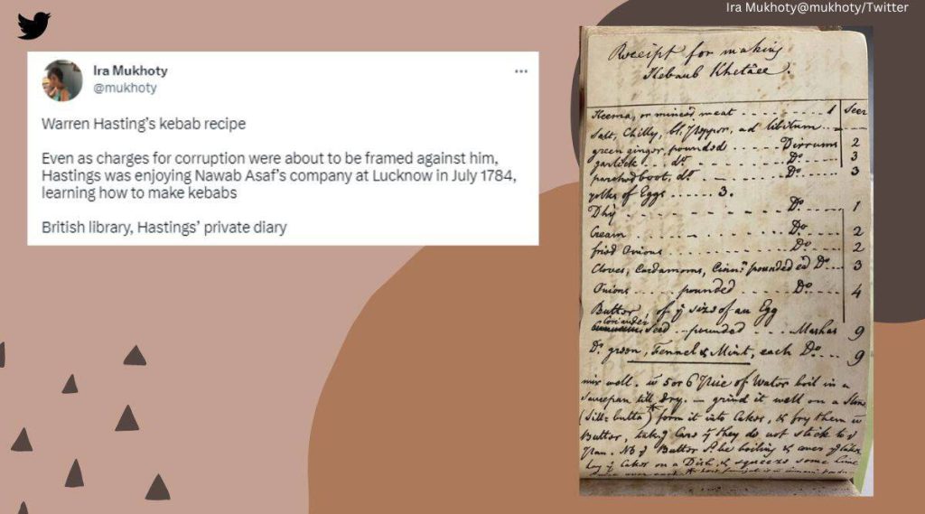 تضمن منشور موخوتي صورة لصفحة من اليوميات وبداخلها وصفة لصنع الكباب، وكتبت المؤلفة تحت الصورة، التوضيح الآتي: «وصفة كباب وارن هاستينغز. حتى مع اقتراب توجيه تهم الفساد ضده، كان هاستينغز يستمتع بصحبة نواب أساف في لكناو في يوليو 1784، حيث تعلم كيفية صنع الكباب، حسب ما جاء بمذكرات هاستينغز الخاصة في المكتبة البريطانية».