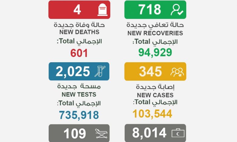 (الصحة) الكويتية: 345 إصابة جديدة ب (كورونا) والإجمالي 103544 وتسجيل 4 حالات وفاة