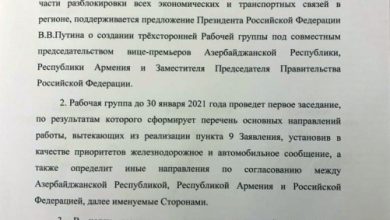 .٠١.٢٠٢١ [٢٢:٤٨] موسكو، 11 يناير، أذرتاج وقع رئيس الجمهورية الأذربيجانية إلهام علييف ورئيس الوزراء الأرميني نيكول باشينيان ورئيس الاتحاد الروسي…
